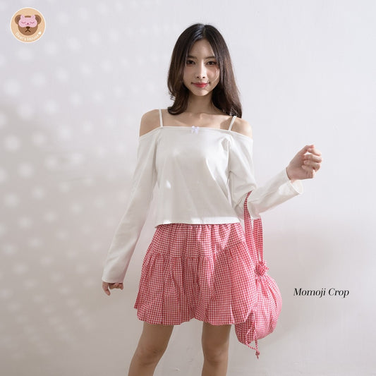 Momoji Crop เสื้อสายเดี่ยว ทรงปาดไหล่ผ้าร่องนิ่ม ดีเทลเเต่งริบบิ้นช่วงอก