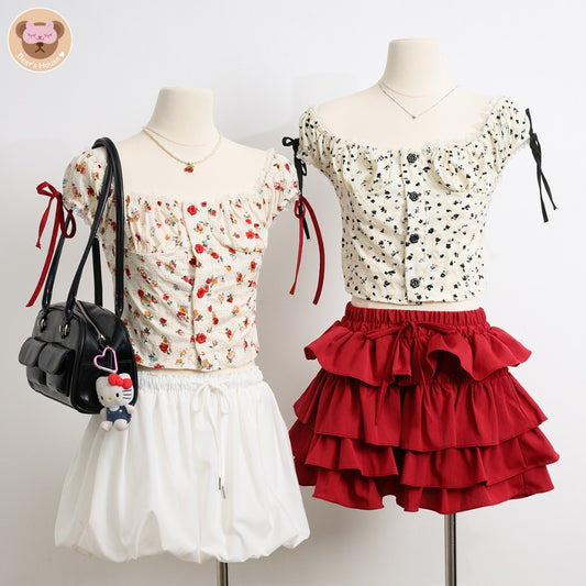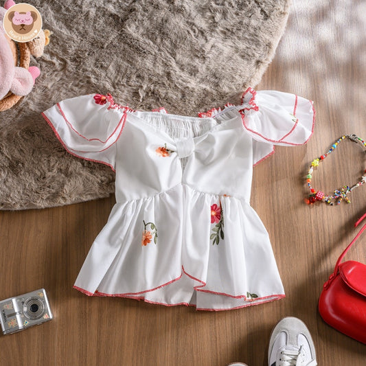 Shawty Top เสื้อเเขนระบาย 2 ชั้น เเต่งโบว์ด้านหน้า