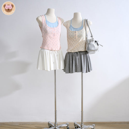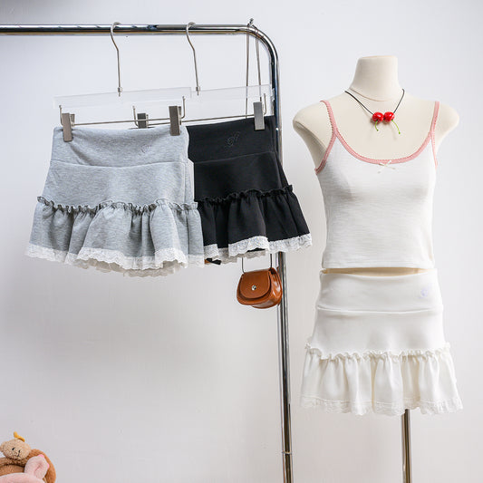 Gangnam Skirt กระโปรงพลีทสั้น เเต่งขอบลูกไม้ งานป้าย