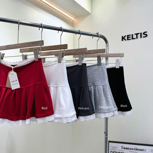 • Gangnam Skirt กระโปรงพลีทสั้น เเต่งขอบลูกไม้ งานป้าย